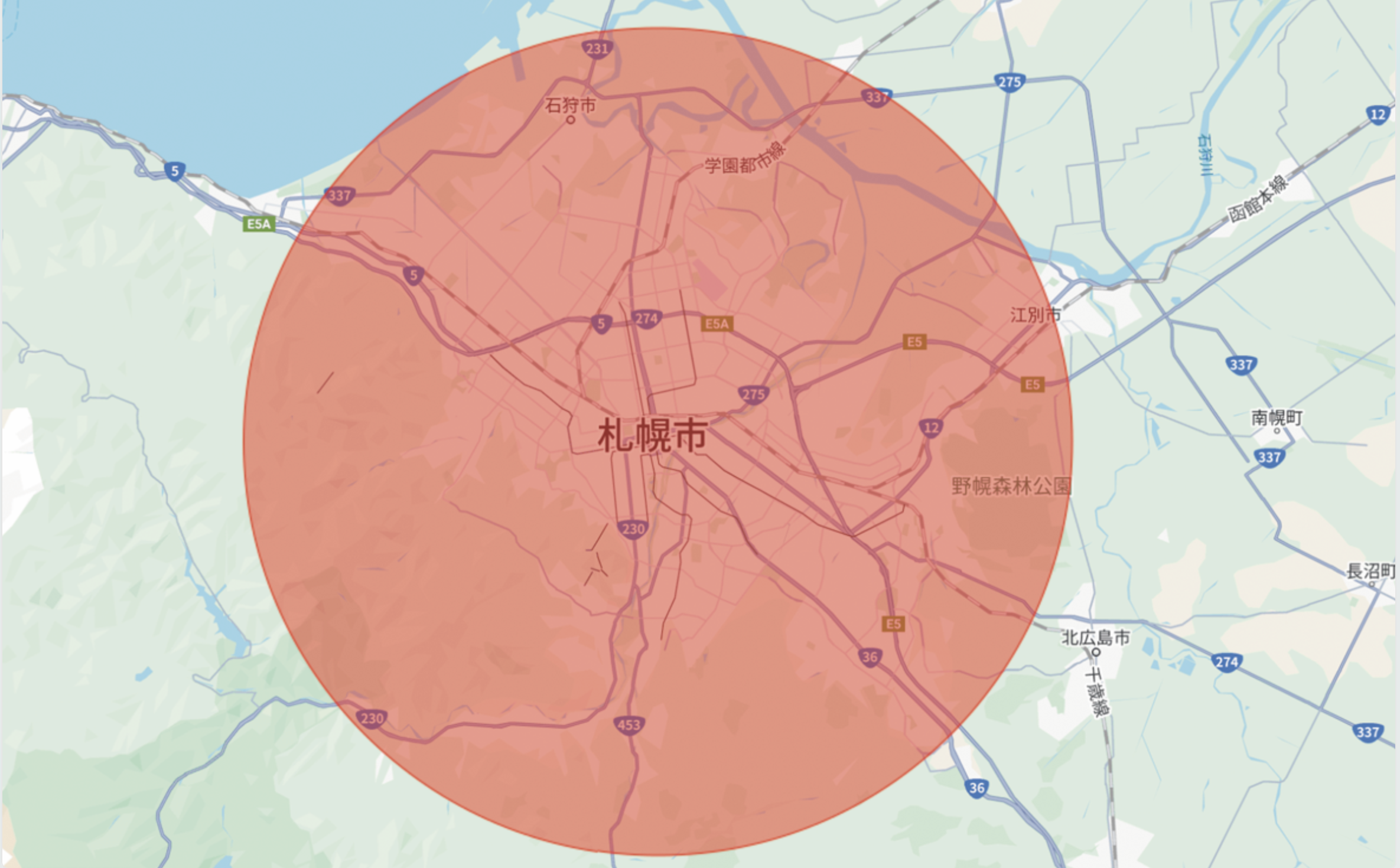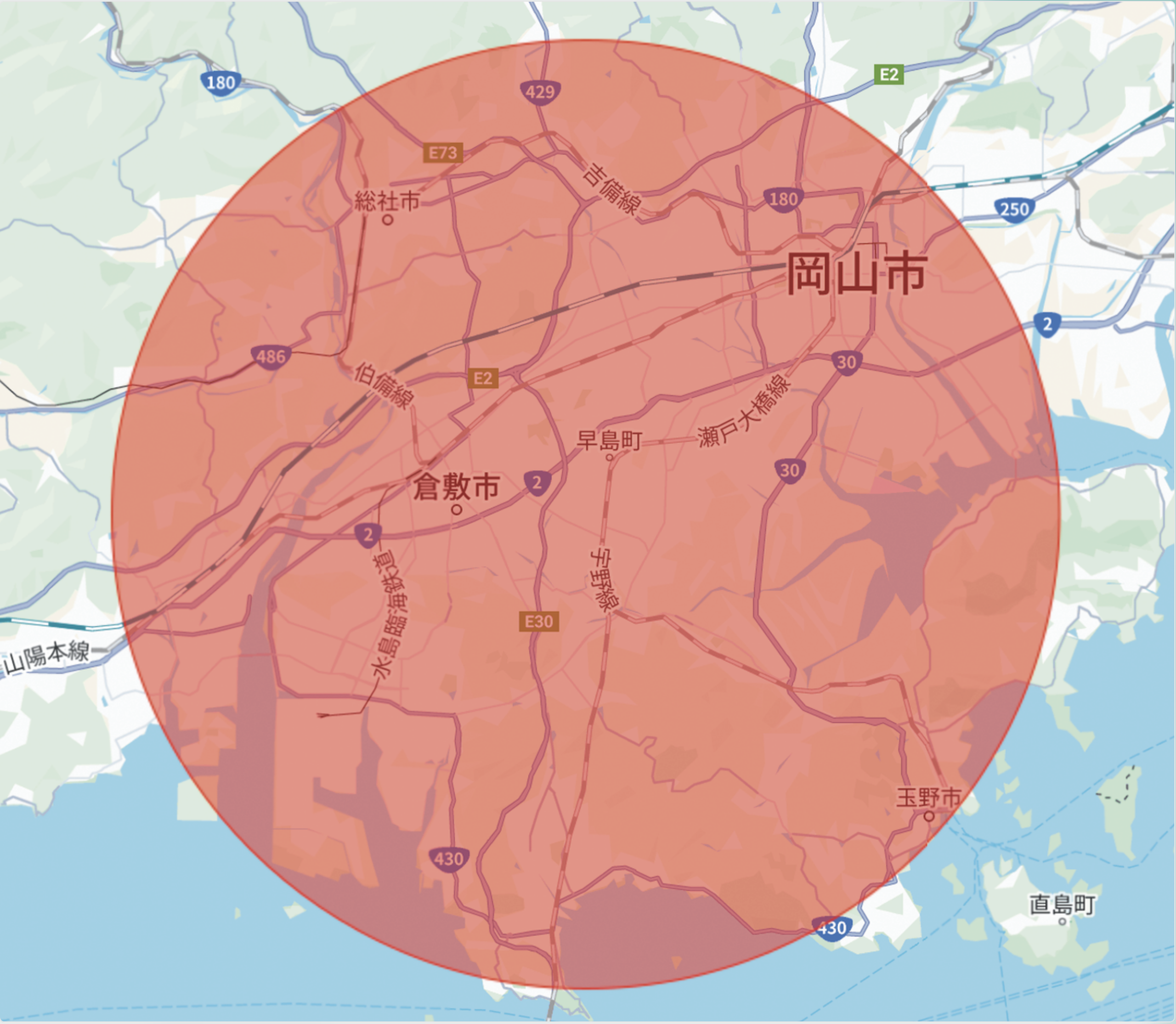 右記地図の赤丸範囲内での訪問が可能です。訪問可能な地域がご不明な場合は、お気軽にお問い合わせください。